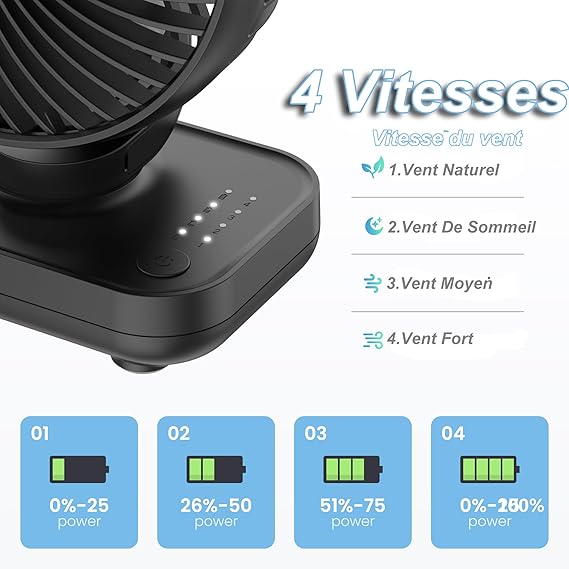 【Hız ve 90° açı ayarlanabilir küçük vantilatörler】Bu taşınabilir vantilatör 4 ayarlanabilir hız ile farklı ihtiyaçlarınız için uygundur. Hızı değiştirmek için sadece açma/kapama düğmesine basın. 90° ayarlanabilir vantilatör farklı durumlarda farklı ihtiyaçlarınızı karşılayabilir.
