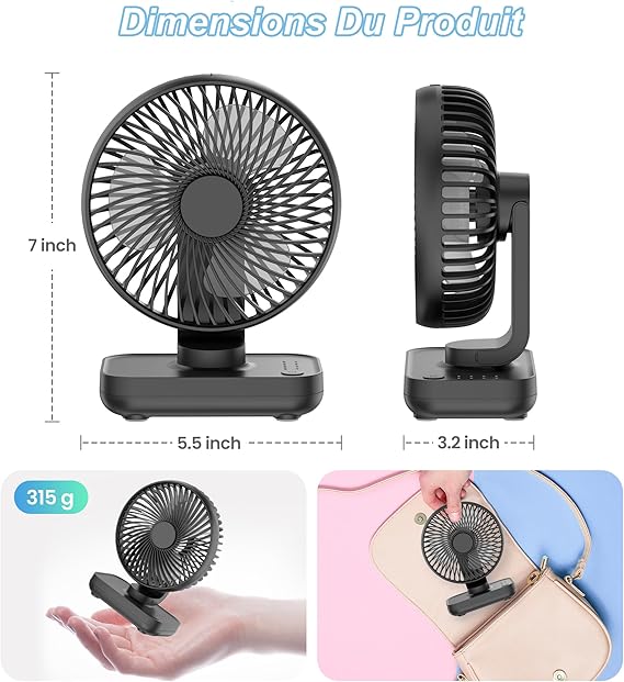 【Taşınabilir ve kolay taşınır】: 13,8 x 7,5 x 18,3 cm ölçülerinde ve sadece 0,4 kg ağırlığında küçük vantilatör. Kompakt tasarımı sayesinde bu vantilatör kolay taşınır ve yatak odalarında, ofislerde, seyahatlerde veya açık havada pikniklerde kullanım için mükemmeldir.