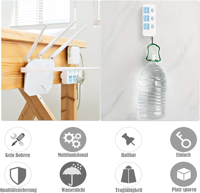 2. Kendinden yapışkanlı çift taraflı tasarım: İki kanca birbiriyle işbirliği yapar. Her nesneyi kolay ve rahat bir şekilde asabilirsiniz, asılı delik konusunda endişelenmek zorunda kalmazsınız. Duvar ve tavandaki her evrensel kanca 10 kg’a kadar taşıyabilir. Delme yok, çivi yok, vida yok