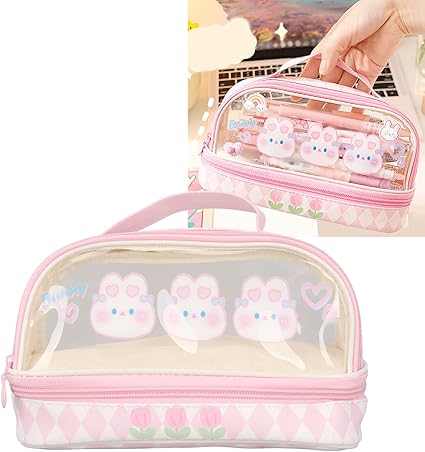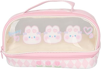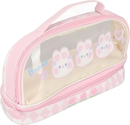 Sevimli Tavşan Kalem Kutusu Kawaii Çocuklar için Kalem Kutusu Tavşan Desen Çift Katmanlı Su Geçirmez Şeffaf Kawaii Kalem Kutusu Pembe Kozmetik Çantası Taşınabilir