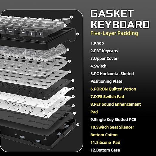 【Beş Katmanlı Dolgu ve Conta Montajı X85 oyun klavyesi, PORON köpük katmanları, IXPE anahtar pedi, PET ses geliştirme pedi ve alt silikon ped dahil olmak üzere beş katmanlı bir ses ve şok emici iç tasarıma sahiptir. Bu tasarım, oyuk gürültüyü önemli ölçüde azaltır ve “Contaya” basıldığında hoş bir geri yükleme kuvveti ile karakteristik yumuşak, esnek hissini verir.