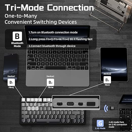 【Üçlü Modlar ve 5000mAh Pil】Contalı mekanik klavyenin, USB tip-c kablosunu, Bluetooth 5.0 ve 2.4Ghz bağlantısını destekleyen 3 bağlantı modu vardır. Aynı anda Bluetooth aracılığıyla 3 cihaza kadar bağlanabilir. Bağlantı modu kolayca yapılabilir. klavyenin arkasındaki tuşlarla değiştirilir. 5000mAh yüksek kapasiteli pil ve otomatik uyku güç tasarrufu teknolojisi, uzun ömür ve istikrarlı bağlantı sağlar.