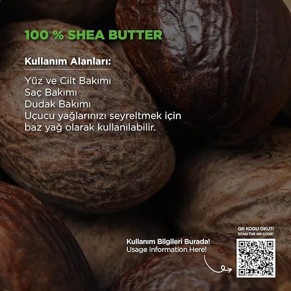 Kullanımı: Vücudun ihtiyaç duyduğu bölgeye masaj şeklinde uygulanır. Shea yağı nemlendirici, merhem ve losyon şeklindeki kullanılabilinir. Cildiniz için yaptığınız bütün doğal karışımlarda kullanılabilir. Cilt kırışıklıklarının oluşumunu engellemeye ve cildi nemlendirmeye yardımcı olmaktadır. Saç için kullanılacaksa hafif ıslatarak saç derisine masaj yapılır, bir süre bekletilip duşta arındırılır.Saç kafa derisi kuruluğunu azaltır. İşlem gören saçların onarılmasında ve yumuşamasında yardımcı olur. Uyarılar: Oda sıcaklığında ağzı kapalı, ışık almayan yerde saklayınız.