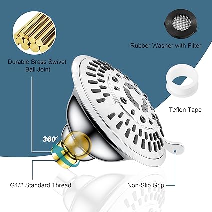 SHOWERS Yüksek Basınçlı 5 Fonksiyonlu Yağmur Duş Başlığı, Krom Kaplama Kaplamalı Lüks Banyo Duş Başlığı, Ayarlanabilir Açılar, 1 Dakika Kurulum