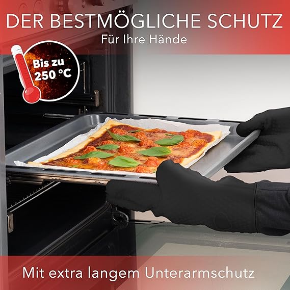 Isıya dayanıklı – 250°C’ye kadar ısı koruması. Yüksek kaliteli fırın eldivenlerimiz ellerinizi yanmalara karşı en iyi şekilde korur.