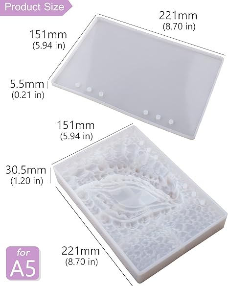 【ŞEKİL】– Silikon döküm kalıplar 221 x 151 x 30,5 mm ve 221 x 151 x 5,5 mm, A5 not defteri üretimi için uygundur ve 30 mm halka bağlayıcı ile kullanılabilir.