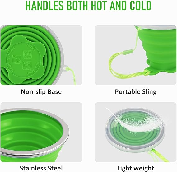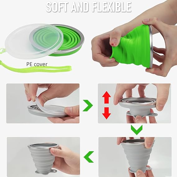【Yüksek Kalite】Katlanabilir seyahat kupası silikon, paslanmaz çelik jant ve plastik sızdırmazlık kapağından yapılmıştır. Temizlemesi kolay, kokusuz, leke bırakmaz, dayanıklı, esnek ve tekrar kullanılabilir.