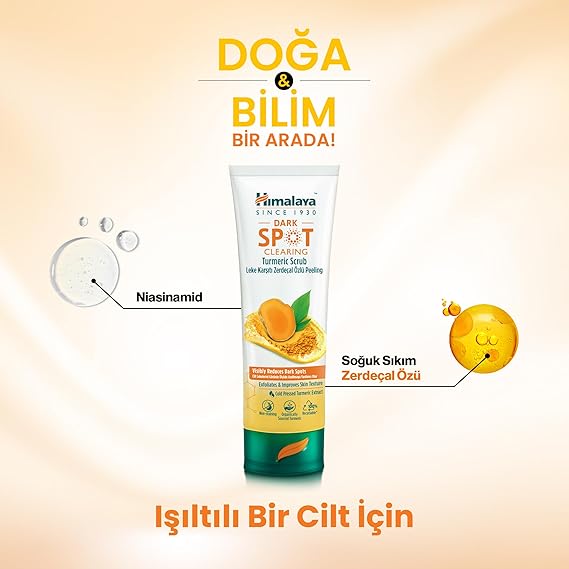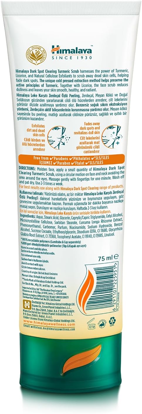 Himalaya Leke Karşıtı Zerdeçal Özlü Peeling, Zerdeçal, Meyan Kökü ve Doğal Selülozun gücünden yararlanarak cildi ölü hücrelerden arındırır.