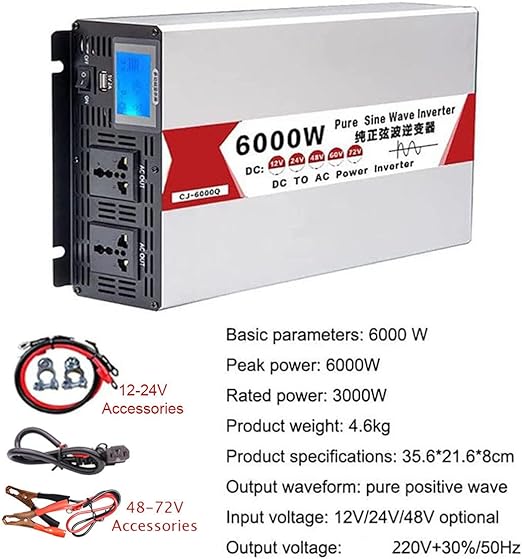 Sinüs Dalgası İnvertörü (Tepe 4000W 5000W 6000W 8000W), DC 12V 24V 48V 60V ila AC 220V Güç İnvertörü RV, Kamyon, Araba, Kamp, Ev Kullanımı için, Çift Soğutma Fanları ve LCD Ekran,6000W-12V