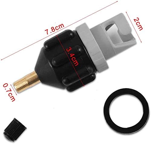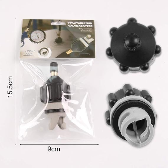 SUP elektrikli pompa adaptörü, hava kompresörü veya bisiklet/lastik pompası ile birleştirmek için standart bir Schrader valf bağlantısı kullanır.
