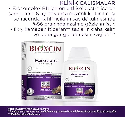 Bıoxcın Siyah Sarımsaklı Şampuan, içeriğinde bulunan siyah sarımsak ve BIOCOMPLEX B11 içerikleri ile saç dökülmesini engeller; saça hacim, canlılık ve parlaklık katar.