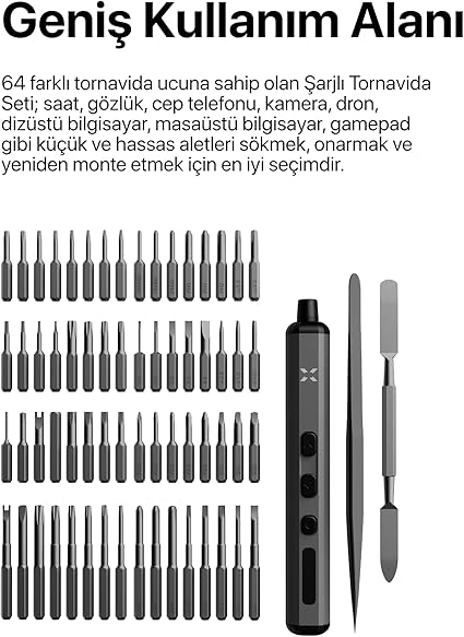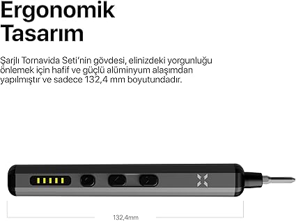 [Taşınabilir boyut]: Xenon Smart Şarjlı Tornavida Seti cebinize, çantanıza ve alet çantanıza kolayca sığacak şekilde hafif ve kompakt bir tasarıma sahiptir.