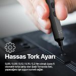 [Hassas tork ayarı]: 0,05 / 0,09 / 0,12 / 0,15 / 0,2 Nm olmak üzere 5 otomatik torka sahip olan Şarjlı Tornavida Seti, yapacağınız işe uygun kuvveti sağlar.