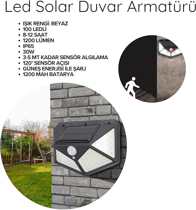 Solar Hareket Sensörlü Dış Ortam Bahçe Aydınlatması, Güneş Enerjili, Su Geçirmez, 100 Ledli, Beyaz Işık, (2 Adet)