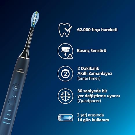 Sonicare DiamondClean 9000 Şarjlı Diş Fırçası, 4 Temizlik Modu, Basınç Sensörü, Seyahat Kabı ve Uygulama Desteği, Lacivert Geçişli, HX9911/88