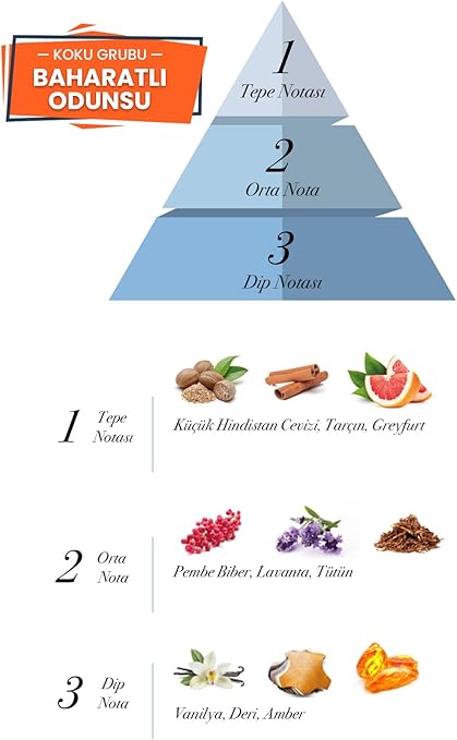 4. KOKU NOTALARI: EDP parfüm (Eau de Parfum) yoğunluk olarak en fazla koku veren parfümlerdir, etkisini gün boyu yanınızda hissedersiniz. Tepe notalarında küçük hindistan cevizi, tarçın ve greyfurt bulunur. Bu notalar parfüme enerjik bir başlangıç sağlar ve ferah bir etki yaratır. Orta notalarda pembe biber, lavanta ve tütün bulunur. Bu notalar parfüme baharatlı ve odunsu bir karakter katar, aynı zamanda sıcak ve çekici bir his uyandırır. Baz notalarda vanilya, deri ve amber bulunur. Bu notalar parfüme derinlik ve kalıcılık sağlar.