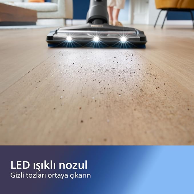 360 derece emiş başlığı sayesinde: her geçişte tozu ve kiri toplar. Geriye doğru hareket ederken ve evinizin köșelerinde bile performansından ödün vermez