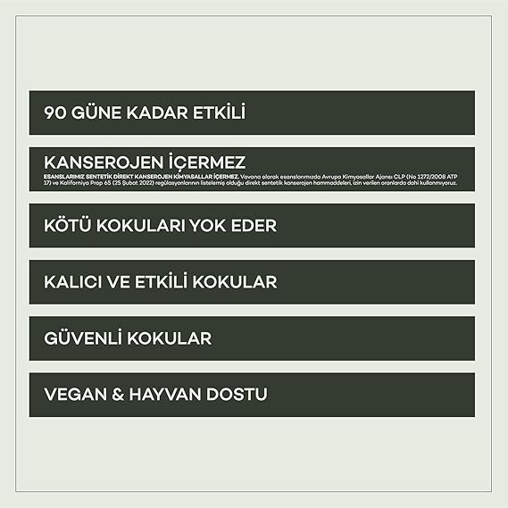 BPA ve Sıvı İçermez – Güvenli Kullanım! VAVANA oto kokusu, sağlığınıza zarar verebilecek sentetik ve kanserojen maddeler içermez. Kimyasal sıvılar veya yapay koku veren maddeler yerine, doğal ve ferahlatıcı bir formüle sahiptir. Araç içinde gönül rahatlığıyla kullanabilirsiniz!