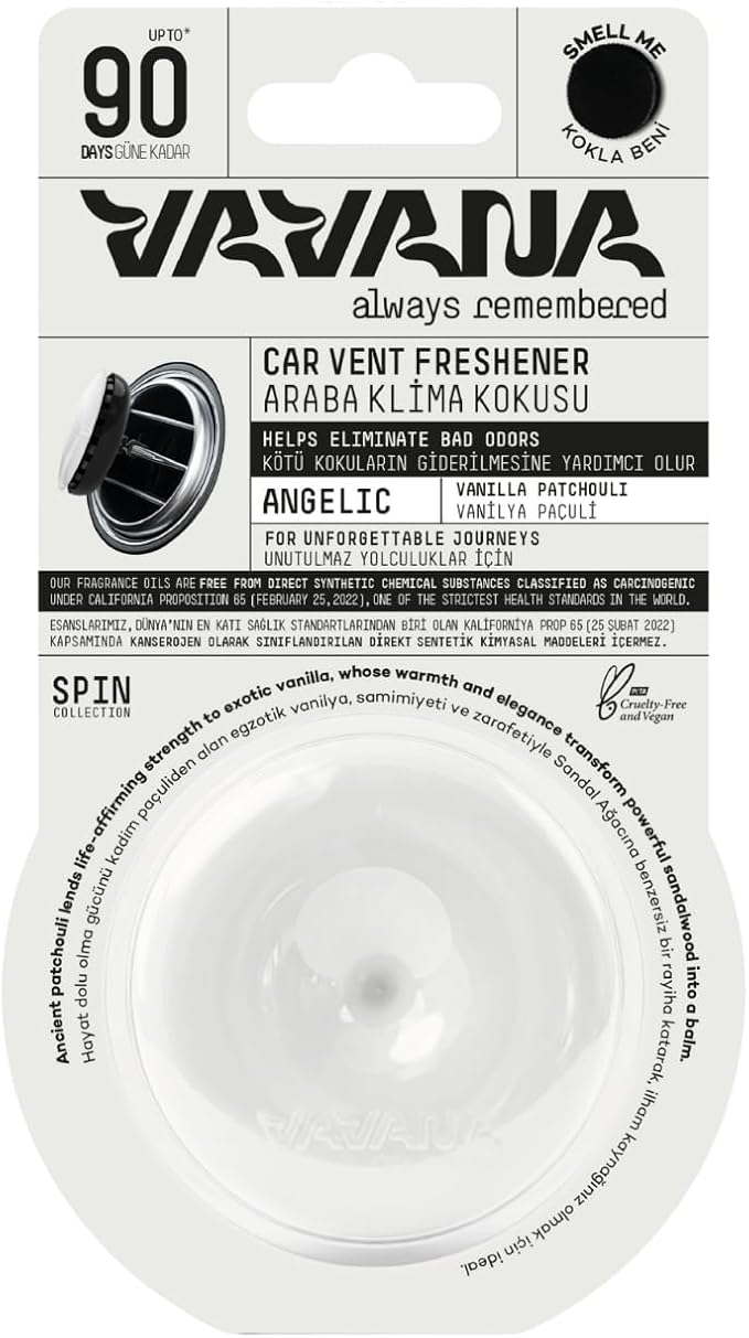 Spin Araba Klima Kokusu – Vanilya Paçuli Aromalı Oto Kokusu | BPA & Sıvı İçermez | 90 Gün Etkili Araç Kokusu (ANGELIC)