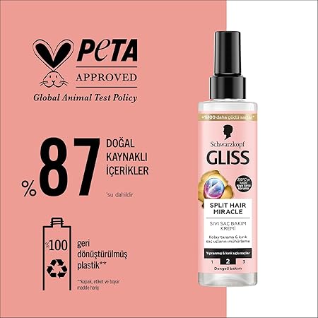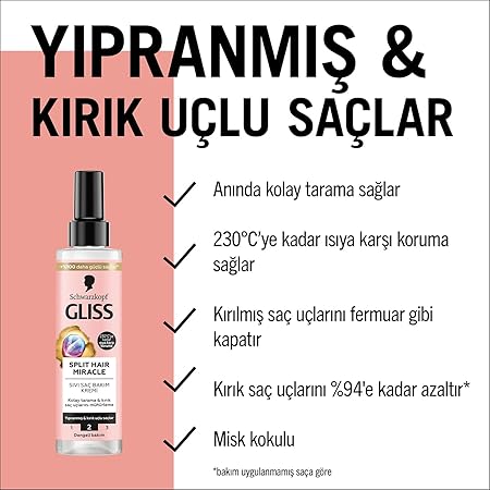 Saçı Besleme ve Nemlendirme: Gliss Split Hair Miracle, saçı derinlemesine besleyerek ve nemlendirerek saçın yumuşak ve pürüzsüz olmasını sağlar