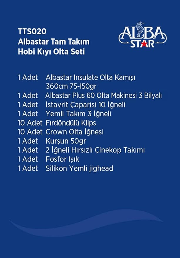 Olta seti içeriği: 1 adet Albastar insulate 350 cm, 75-150 gr atarlı olta kamış, 1 adet Albastar insulate 50 bir bilyalı olta makinesi, 1 adet istavrit çaparisi 10 iğneli, 1 adet yemli takımı 3 iğneli, 10 adet fırdöndülü klips, 1 adet üçlü mercan çupra takımı, 1 adet kurşun 50 gr, 1 adet silikon yemli jighead, 1 adet hırsızlı çinekop takımı, 2 iğneli 1 adet fosforlu ışık