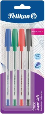 Pelikan Stick tükenmez kalem seti, dört farklı renk içerir: siyah, mavi, sarı ve kırmızı Blister ambalajda sunulan bu set, günlük kullanım için uygundur Kalemler orta kalınlıkta uç özelliğine sahiptir Mürekkep akışı düzenli ve yazım kalitesi tutarlıdır Bu tükenmez kalemler okul, ofis veya ev kullanımı için tercih edilebilir