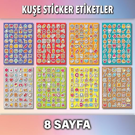 Malzeme ve Baskı Kuşe kağıt sticker üstüne son teknoloji dijital ofset baskı yöntemi ile hazırlanmıştır. Renk ve doku olarak size en üst kaliteyi garanti eder. Etiketlerin her biri kendinden kesimli ve yapışkanlıdır. Yalnızca istediğiniz parçayı kağıttan ayırmanız yeterlidir. Setin toplamı 8 adet A5 ebat (21×15 cm.) etiket sayfasından oluşmaktadır.