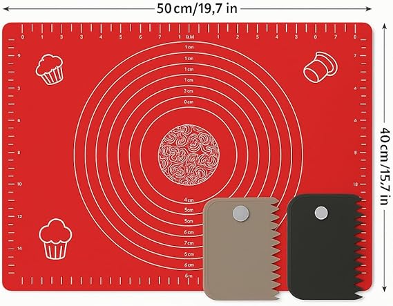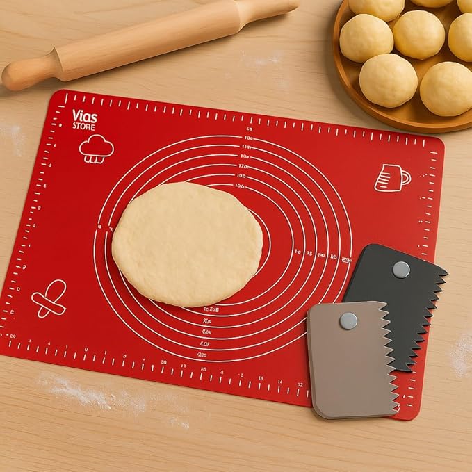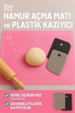 Store Hamur Açma Matı 50×40 cm ve 3’lü Plastik Kesme Kazıma Aparatı – Silikon Kaymaz Mat + Çok Amaçlı Mutfak Kazıyıcı Seti (Kırmızı)