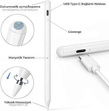 Stylus Kalem – USB-C Hızlı Şarj, Avuç İçi Reddetme, 8 Saat Kullanım, Tüm iPad 6/7/8/9/10, Air, Pro ve Mini Modeller İle Uyumlu(2 Adet Yedek Uç)