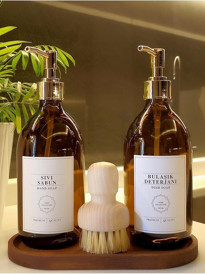 Su Geçirmez Oval Stantlı Fırçalı Beyaz Gold Sıvı Sabun Bulaşık Deterjanı Şişe Seti