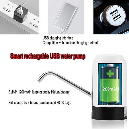 USB ile şarj edilebilir su pompası: Dahili, şarj edilebilir 1200 mAh pil. 30-40 gün veya yakl. Pil tamamen şarj olduğunda, 4-6 adet 5 galon damacana su kullanılabilir