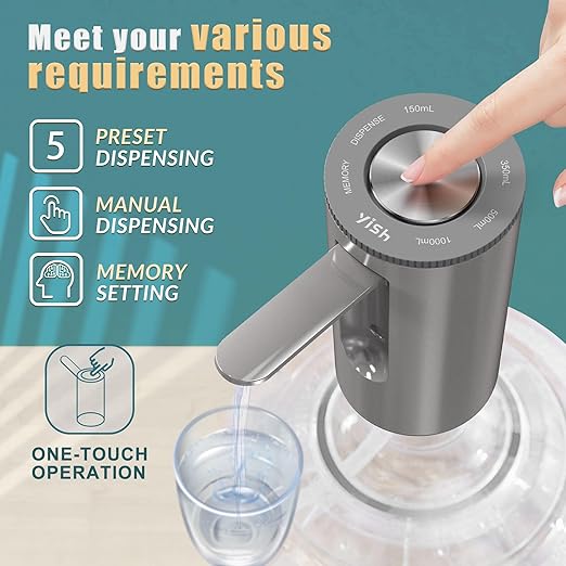 Önceden ayarlanmış birden fazla su miktarı: Su şişesi pompası beş su miktarı ayarını destekler (150 ml, 250 ml, 350 ml, 500 ml ve 1000 ml). Bellek fonksiyonu sayesinde son kullanılan miktar otomatik olarak kaydedilir. Birden fazla ayarlamaya gerek yoktur, kullanımı daha rahattır.