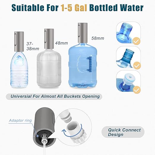 Geniş uyumluluk: Dağıtıcı 1 ila 5 galon su şişeleri ile uyumludur. 38 mm ve 48 mm çaplı iki adaptör ile teslim edilir. (Gerektiğinde iki adaptör kullanım için üst üste istiflenebilir.)