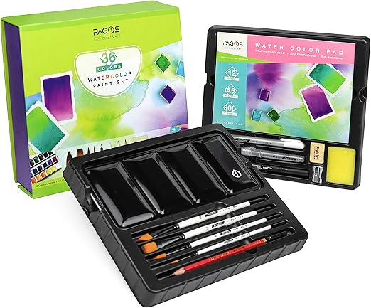 Ne alıyorsunuz: 36 çok zengin sulu boya tavasının yanı sıra bu set ile 12 yaprak A5 sulu boya pedi, 4 sulu boya fırçası, doldurulabilir fırça kalemi, çift fırça kalemi, sulu boya makyaj jel kalem, sünger, kurşun kalem, silgi alırsınız
