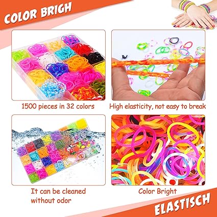 ✨✨Renkli lastik bant kitleri: ✅ 1500 32 renkli elastik bant, 80 harf boncuk, 20 kova boncuk, 10 meyve boncuğu, 12 plastik kolye, 3 anahtarlık, 2 adet tığ işi, 2 x Y alet, 36 S toka, 1 saklama kutusu, 1 kullanım kılavuzu içerir. (Sarkıt aksesuarların rengi rastgele yapılır, alınan gerçek ürüne bağlıdır)