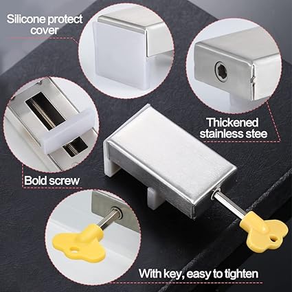Kaliteli sürgülü kapı kilidi: Kalınlaştırılmış paslanmaz çelikten (121,5 g) üretilmiştir, sürgülü kapı kilidi süper güçlü ve uzun ömürlüdür ve uzun süre kullanılabilir. Sürgülü kapı emniyeti, pencerenin çizilmesini ve aşınmasını önlemek ve kavramayı arttırmak, kilitlemek ve pencerenin güvenliğini artırmak için kauçuk bir yastık ile donatılmıştır.