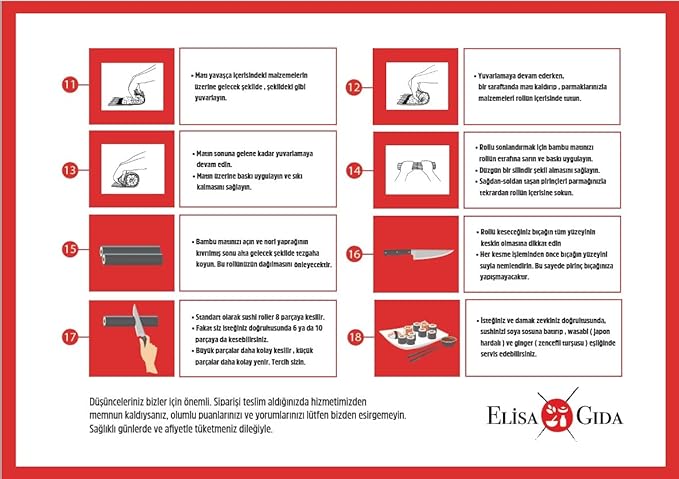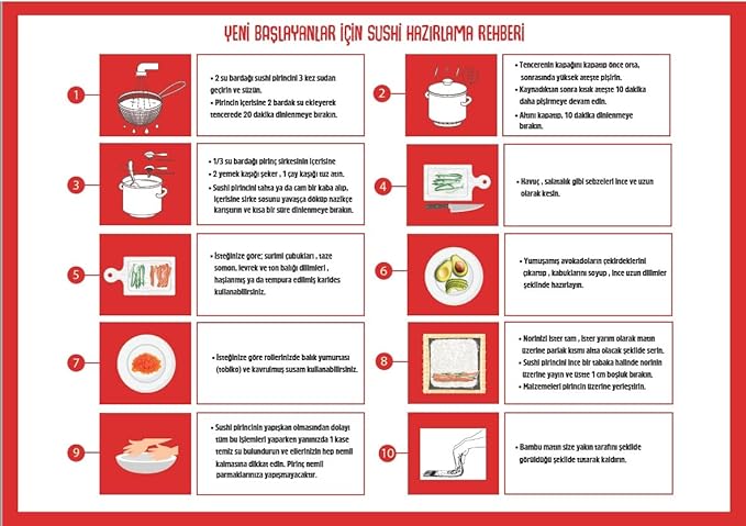 Sushi Pirinci + Nori Set Set 3 farklı üründen oluşur. Setimizle beraber sizin için özel olarak Elisa Gıda tarafından hazırlanan ve içerisinde resimli anlatımların yer aldığı “Yeni Başlayanlar İçin Sushi Hazırlama Rehberi“ne sahip olabilirsiniz.