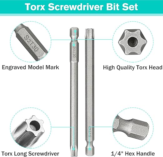 Yüksek kaliteli malzeme: Torx tornavida ucu, yüksek tork ve iyi sertliğe sahip yüksek kaliteli S2 çelikten oluşur. Uzun süre havaya maruz kalsa bile paslanmaz ve parlaklığını korur.