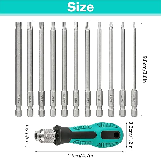 12 adet Torx uç seti: Farklı ihtiyaçlarınızı karşılamak için 100 mm x 6 mm boyutunda 11 Torx uç ve 1 anahtar içerir. Modeller: T6, T7, T8, T9, T10, T15, T20, T25, T27, T30, T40.