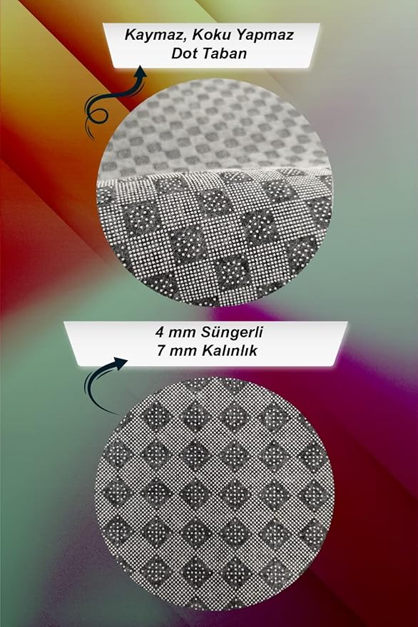 Kalınlık: 7-8mm Üst Yüzey 150gr/m2 Yarı Parlak Kumaş, Orta Bölüm 4mm 26 Dansite Sünger Dolgulu, Alt Yüzey Dökülmez Koku Yapmaz Hijyenik Kaymaz Dot Tabandır.