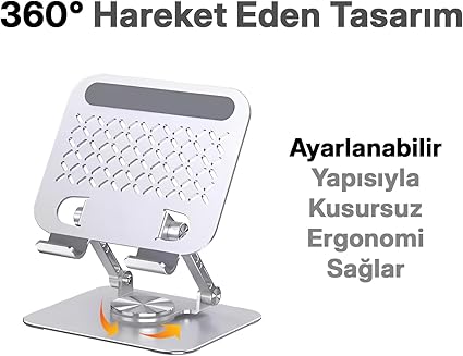 360 Derece Dönebilme: Bu tablet standı, 360 derece tam dönebilme özelliği sayesinde, cihazınızı her açıdan rahatça görmenizi sağlar; böylece video izlerken, okuma yaparken veya sunumlar sırasında tabletinizi en uygun açıda tutabilirsiniz.