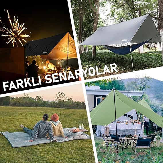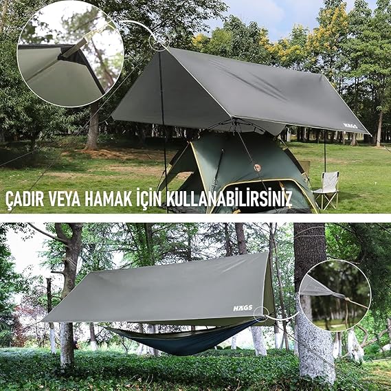 ✅ UV KORUMASI: 300T yırtılmaz polyester kumaştan yapılmış gölgelik Tarp Örtüsü güneş ışınlarının büyük kısmını kırarak zararlı ultraviyole ışınlarından korur. Tarp Tente gölgelik hafif su itici özelliklidir. (Su geçirmez değildir, Yağmur sularını geçirir). Yırtılmaya ve delinmeye karşı dayanıklı malzemesi sayesinde çadır, Kamp vb. Outdoor aktivitelerinde doğada herhangi bir endişe duymadan kullanılabilinir. Haegs Çadır Kamp Tarp Brandası ayrıca gölgelik tente olarak da kullanılabilir, ultraviyole ışınlarını etkili bir şekilde engellemek ve cildinizi güneşten korumak için etkilidir.