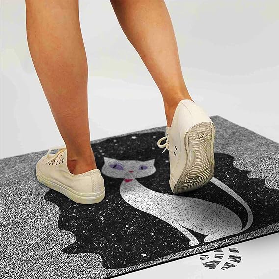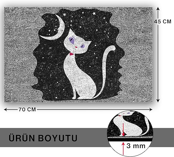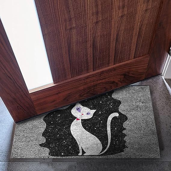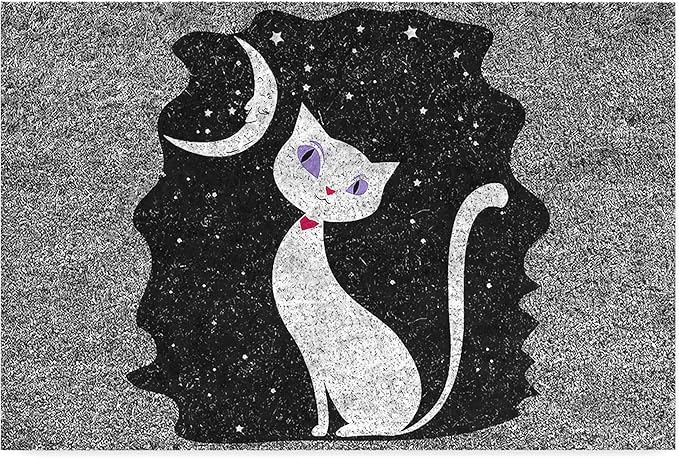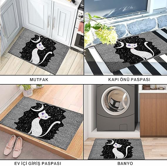 Tasarımlı Dekoratif Kapı önü Paspas, Dış Mekan/Ev İçi/Banyo/Mutfak/Yatak Odası/Giriş Paspasları (Gece Beyaz Kedi, 45X70)