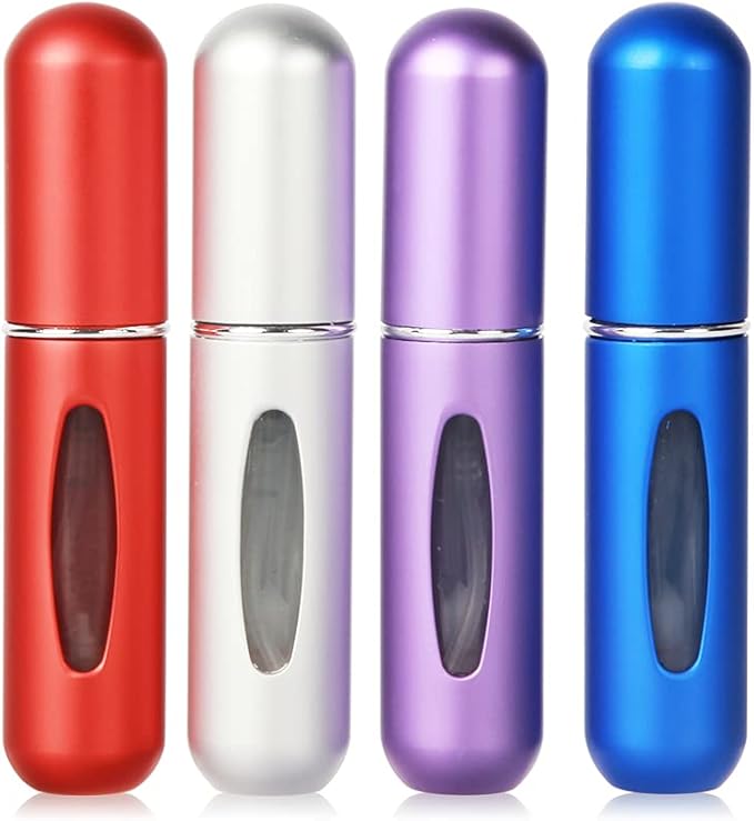 Taşınabilir Atomizer Parfüm Şişesi: 5ml/adet, 4 paket ve 4 farklı renk. Ölçüler: 8,0 x 1,6 x 1,6 cm. Küçük boyutlu ve hafif doldurulabilir parfüm spreyi, etrafta taşımak veya seyahat etmek için uygundur, neredeyse hiç yer kaplamaz