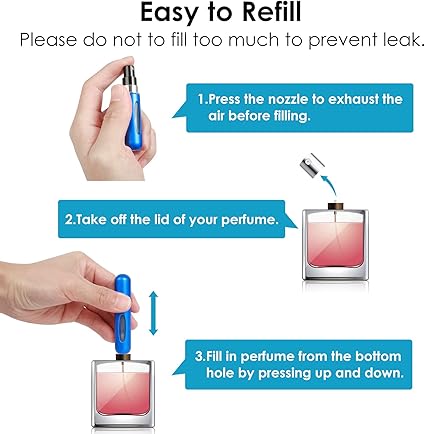 Kullanıma Uygun: Bu seyahat parfüm şişesi doldurulabilir, taşıması kolaydır, kullanımı kolaydır ve doldurulması kolaydır. Yukarı ve aşağı bastırarak doğrudan alt hava deliğinden parfüm doldurun. Şeffaf şişe gövdesi, ne kadar parfüm kaldığını kontrol etmenizi sağlar