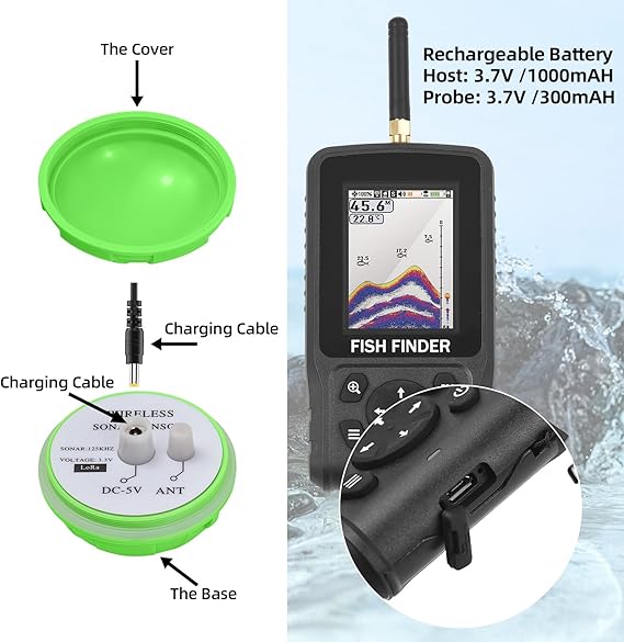 Taşınabilir Balık Bulucu Kablolu 2.6in Renkli Ekran Tasarımı Uzun Mesafe Balıkçılık İçin İdeal Yüksek Parlaklık Algılama Derinliği 2.6-160ft 90° 433MHz Sonar Frekansı 125 KHz Balıkçılık
