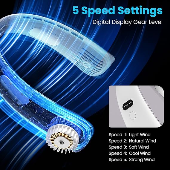 Eller Serbest Kolaylık ve Güvenlik: Kulaklık şeklinde tasarlanan boyun soğutucusu giyilebilir ve ellerinizi serbest bırakır. Bıçaksız tasarım, saçların karışmasını önler, çocuklar ve yaşlılar için güvenli kullanım sağlar. 5 vitesli ayarlarla, kişisel boyun fanı çeşitli soğutma ihtiyaçlarını karşılar