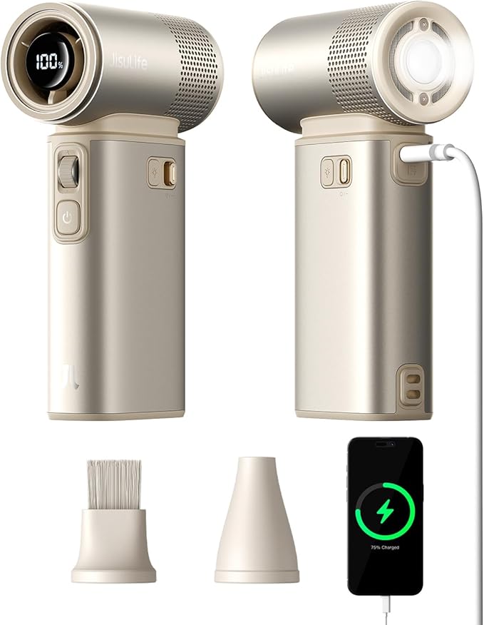 Taşınabilir ve çok yönlü: Seyahat fanı kompakttır ve 2 manyetik hava nozulu ile donatılmıştır, toz giderme aleti ve şişirme pompası olarak kullanılabilir. Metal kabuk yapısı dayanıklılık sağlar, mini tasarım seyahatte, plaja, kampa, tırmanmaya veya konserlere gitmeyi kolaylaştırır, en iyi seçimdir.