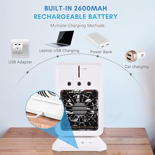Taşınabilir Masa Soğutma Fanı Mini Hava Soğutucu 3 Rüzgar Hızı ile Oda Nemlendirici Ayarlanabilir Rüzgar Yönü Zamanlayıcı Ev Yatak Odası Ofis Açık Kamp Kullanımı için USB Evaporatif