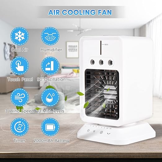 ♦ Hepsi Bir Arada Hava : Taşınabilir klimalar, hava nemlendirici, fan 3’ü 1 arada tasarım. Normal bir küçük fan olarak kullanabilirsiniz; Veya su haznesine biraz buz ve su ekleyin, makine mini bir klima oldu; Dahası, su ekleyin ve nemlendirme işlevini açın, 3 seviyeli nemlendirme yoğunluğu isteğe bağlıdır ve güçlü atomizasyon işlevi, hızlı soğutmadan sürekli soğutmaya kadar ihtiyaçlarınızı karşılar. Uzun süreli kullanımdan sonra kuru cilt için endişelenmenize gerek yok.